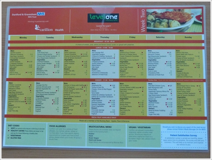 Na stolikach w salach leżało MENU szpitalne i codziennie można było wybrać sobie posiłki z listy. Śniadania były kiepskie, jakieś płatki z mlekiem, czy tosty z dżemem do wyboru, ale za to obiady i kolacje całkiem sobie.