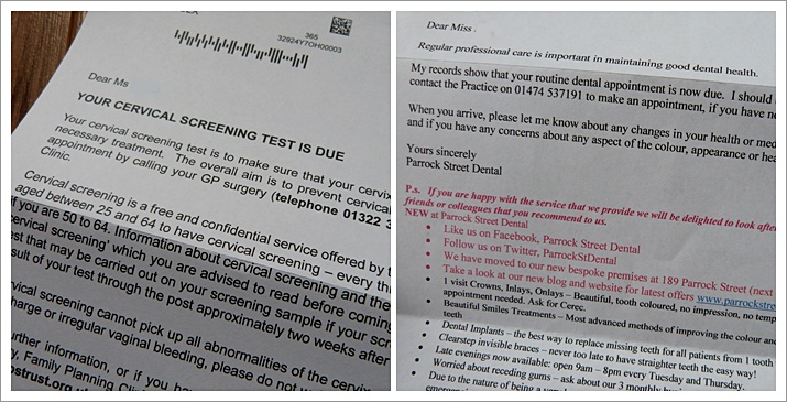 Jeden od mojego dentysty, że powinnam się zjawić na kontrolę, drugi z wiadomością, że powinnam wykonać kolejny wymaz z szyjki macicy (cytologię) w najbliższym czasie.