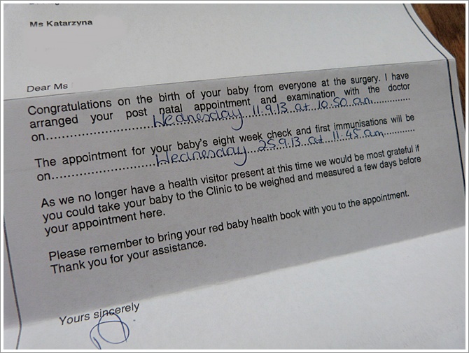 Również moja położna wysłała mi list z terminami wizyt kontrolnych dla mnie i dla Sary.